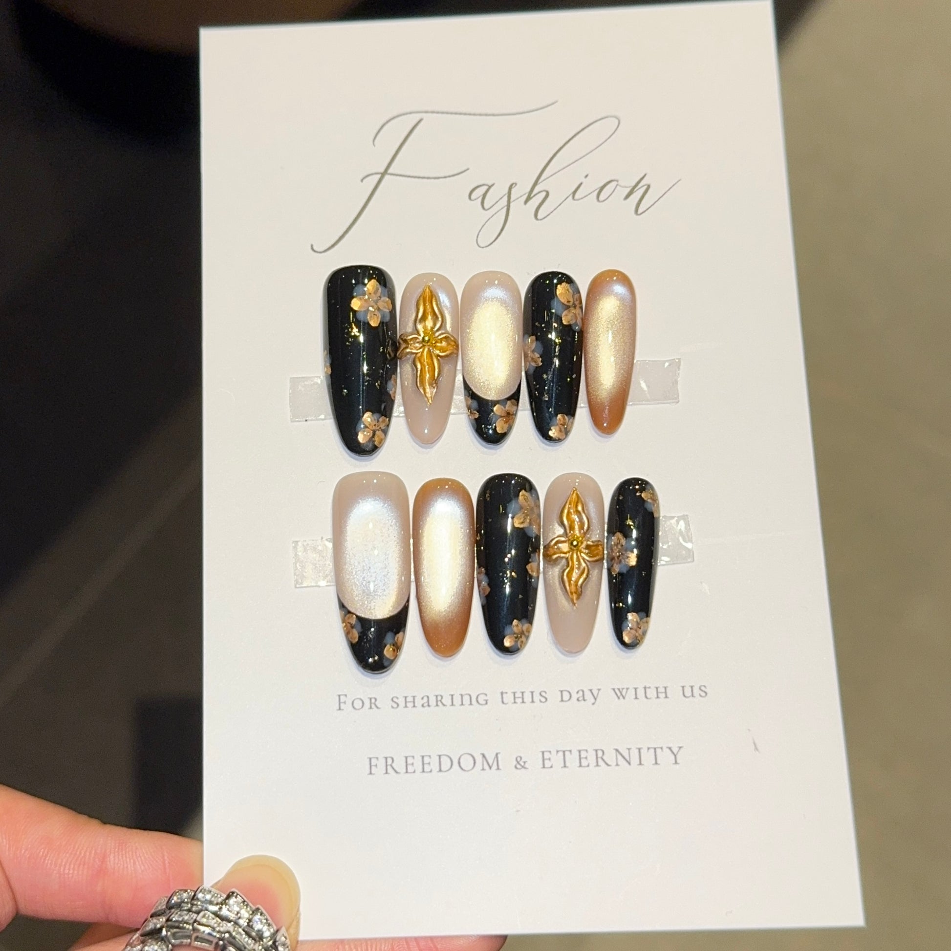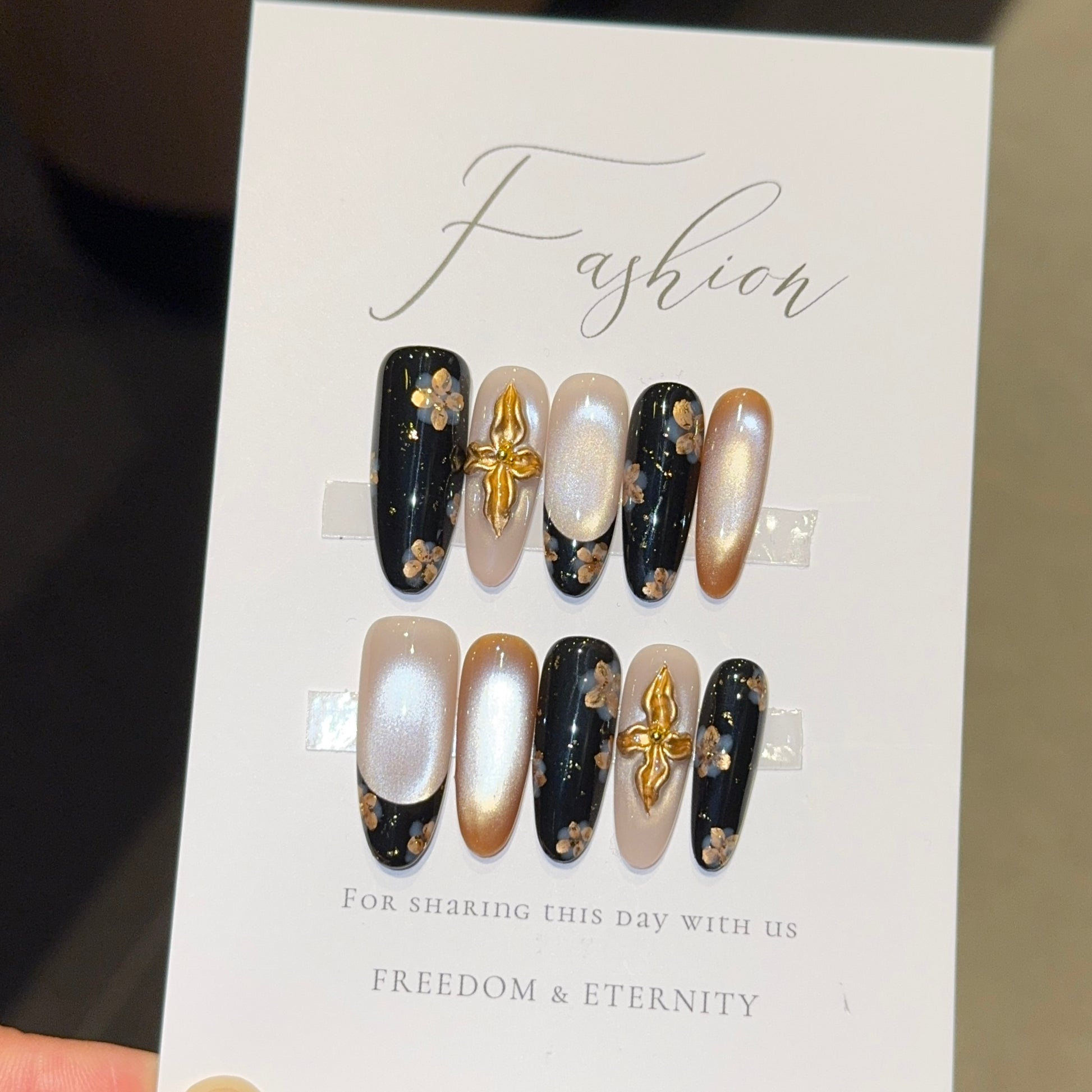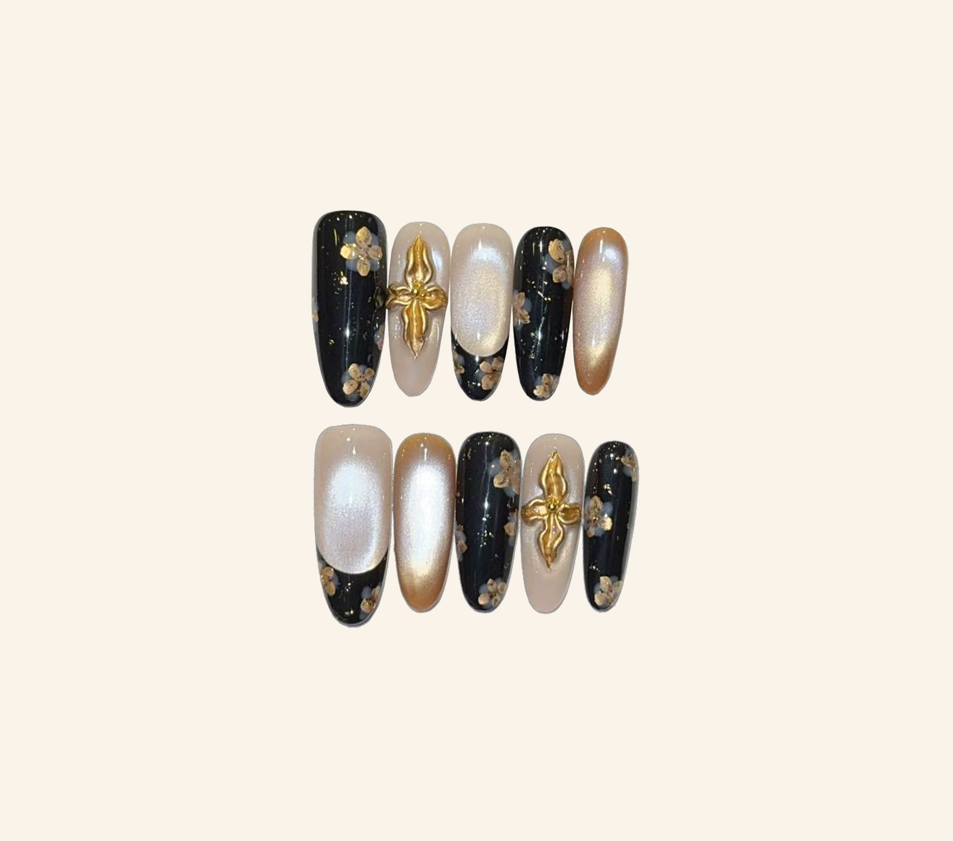 Glamorous winter press-on set featuring a mix of glossy black (with tiny gold floral flecks), shimmery champagne, and soft nude bases—plus eye-catching 3D gold cross accents ✨. The contrast of bold black, luxe gold, and delicate neutrals makes this set perfect for holiday parties, date nights, or adding a touch of edge to cozy winter fits. Easy to apply, long-lasting, and so on-trend for 2025!