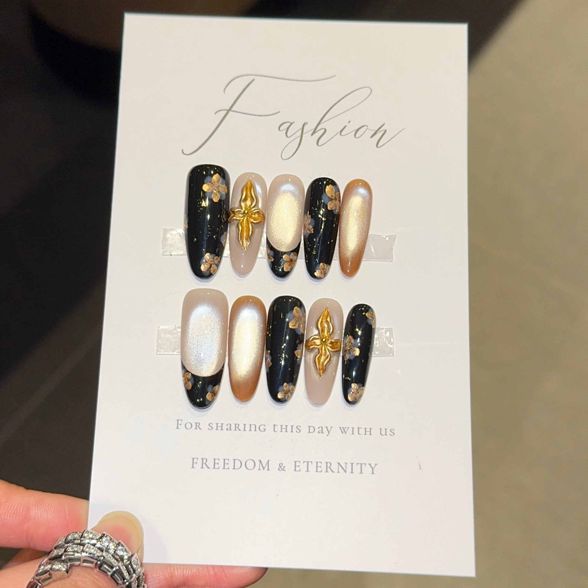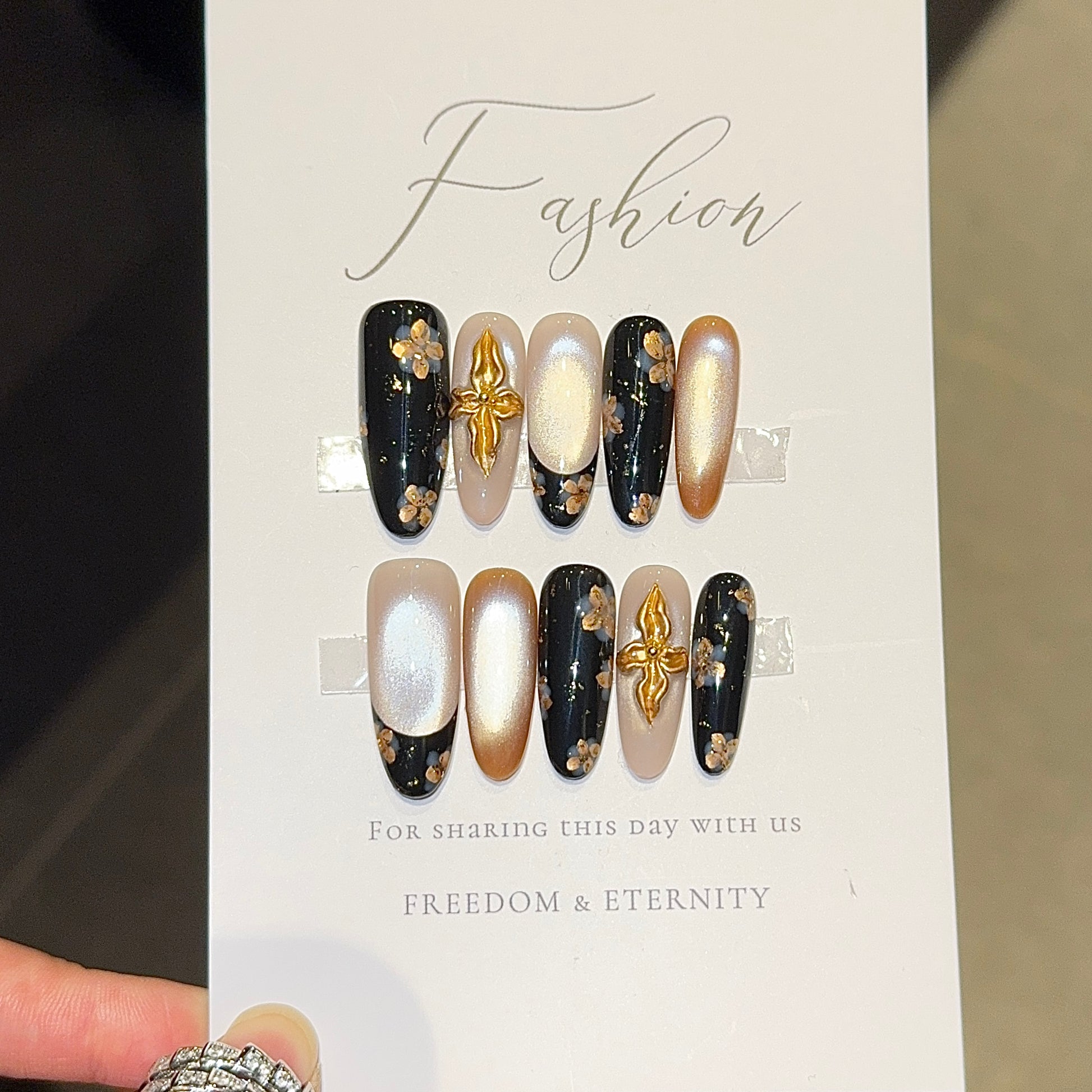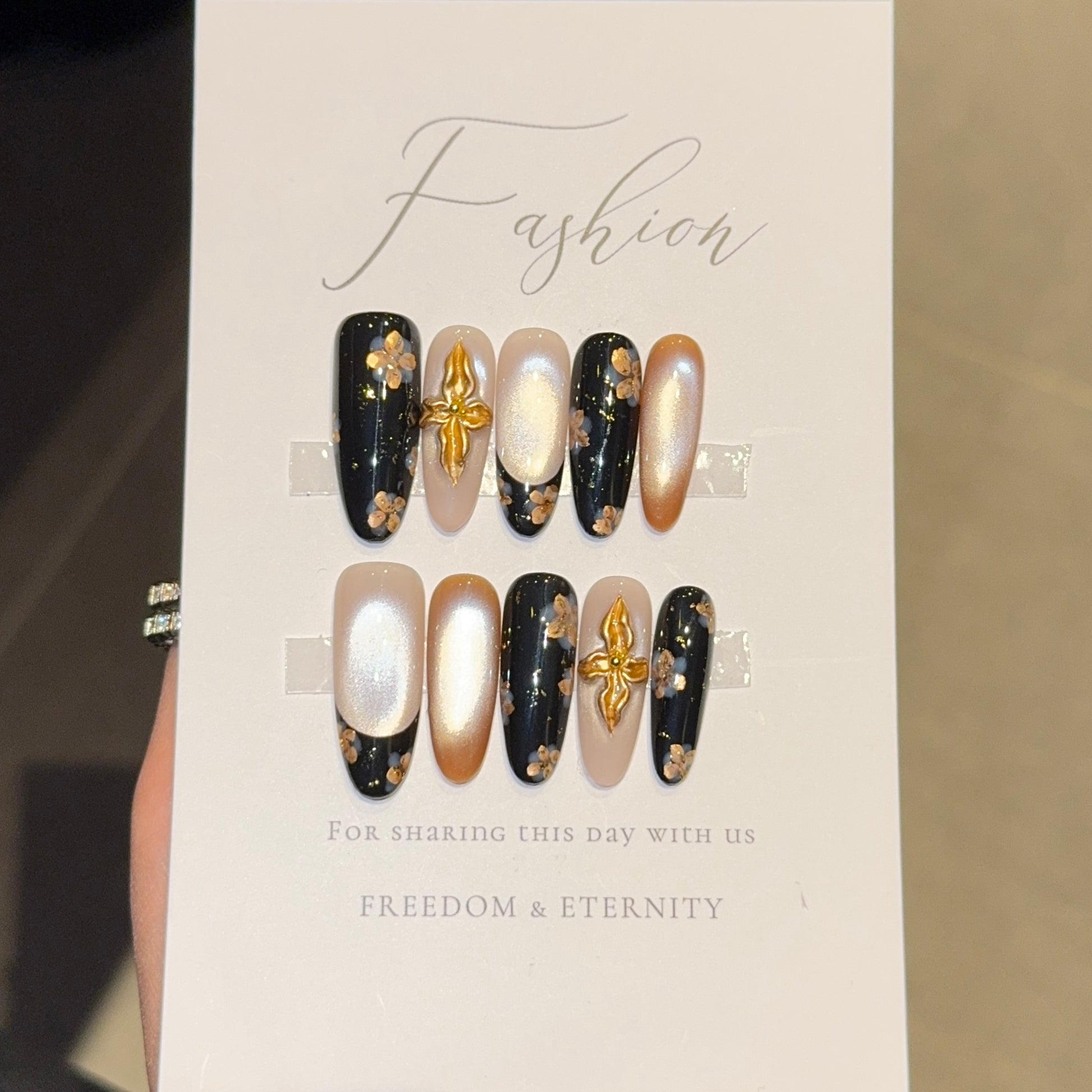 Glamorous winter press-on set featuring a mix of glossy black (with tiny gold floral flecks), shimmery champagne, and soft nude bases—plus eye-catching 3D gold cross accents ✨. The contrast of bold black, luxe gold, and delicate neutrals makes this set perfect for holiday parties, date nights, or adding a touch of edge to cozy winter fits. Easy to apply, long-lasting, and so on-trend for 2025!
